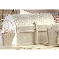 Exquisite ivory satin fabric covers this card box. The fabric has been embroidered with a lovely leaf and vine pattern. It features a 6" x 3/4" slot on top for inserting gifts cards. The money box measures 15" long and 9.25" tall. It can accomodate about 100 gift cards. Ivory color.This card box can also be used as a keepsake box after the wedding.