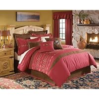 Embodying southwest sophistication, the chimayo king comforter set is sure to warm up any space. This set includes a 110-Inch by 96-Inch comforter, a 79-Inch by 82-Inch bed skirt, and two 37-Inch by 21-Inch shams. The chimayo comforter is comprised of adobe red linen-like embroidered fabric which is reminiscent of hand paint tiles, pottery and woven mexican treasures. Terracotta clay, cactus green, dusty orange, and gold, together add a burst of color and surface design interest to the aztec inspired embroidery. The addition of coffee colored microfiber creates a rustic yet modern feel. The tailored coffee brown bed skirt features adobe red self trim creating a solid anchor for the chimayo ensemble. The king shams feature embroidery surrounding the adobe red fabric. shams feature embroidery surrounding the adobe red fabric.