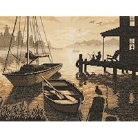 Embrace the tranquility of a waterfront cove, while gentle waves glisten from the sun's last rays and two quiet fisherman linger at the day's end. Kit contains cotton thread, 14 count beige Aida, thread palette, and needle. Finished Size: 13-Inch by 10-Inch