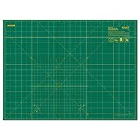 18x 24green self-healing professional quality rotary mat especially designed for use with OLFA rotary cutters. Double-sided with yellow grid lines on one side for precision cutting, solid on opposite for general cutting. Rotary mats protect your work area and greatly extend the life of your rotary blades. 1.5mm thick for a variety of applications. Store flat.